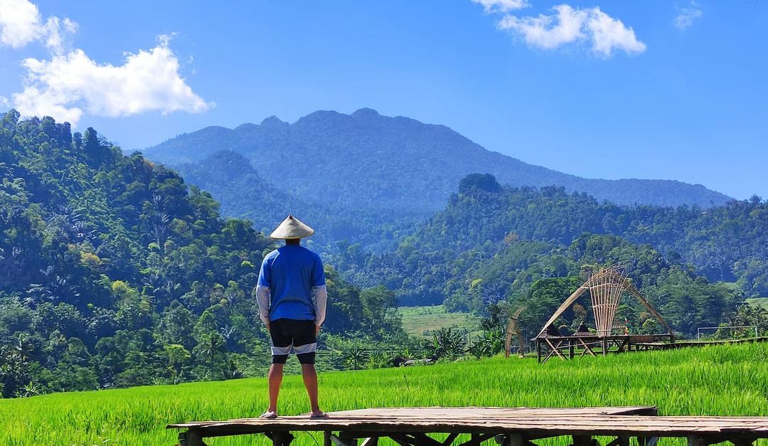 Pengunjung dapat berjalan melalui jalan dari bambu yang melintang di tengan hamparan sawah, sambil berfoto maupun menikmati sejuknya udara, melewati hijaunya tanaman padi disekitar, kemudian pengunjung dapat duduk bersantai di Gazebo yang tersedia.